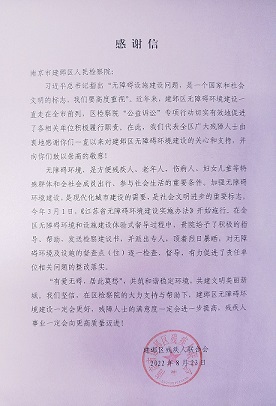 近日,区残疾人联合会向我院寄来《感谢信》,由衷感谢我院对辖区无障碍环境建设的关心和支持。