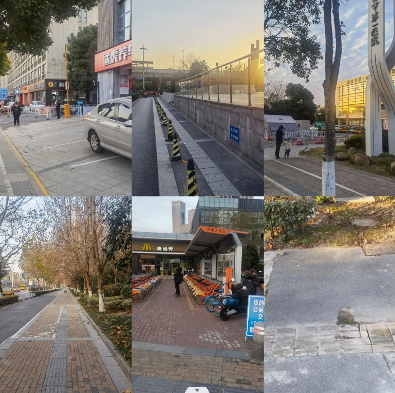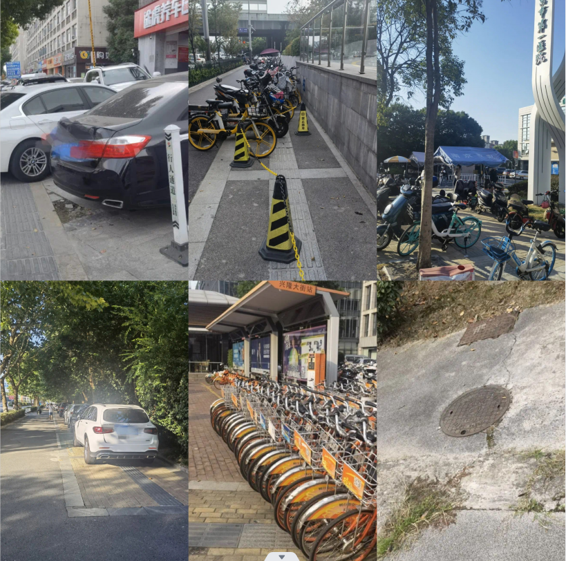▶第一阶段专项行动:2021年9月至11月,主要针对辖区重点路段和重点场所周边的盲道进行走访排查,发现辖区内问题线索17件,主要涉及的问题有:一是人行天桥、重点场所周边道路上的盲道设施破损,形成断头路;二是辖区人流量较大的地铁站出入口附近,存在非机动车占用盲道现象;三是部分沿街商户如汽修门店,存在占用盲道开展经营活动的现象;四是部分安置小区附近违法停放机动车,存在机动车占用盲道现象。