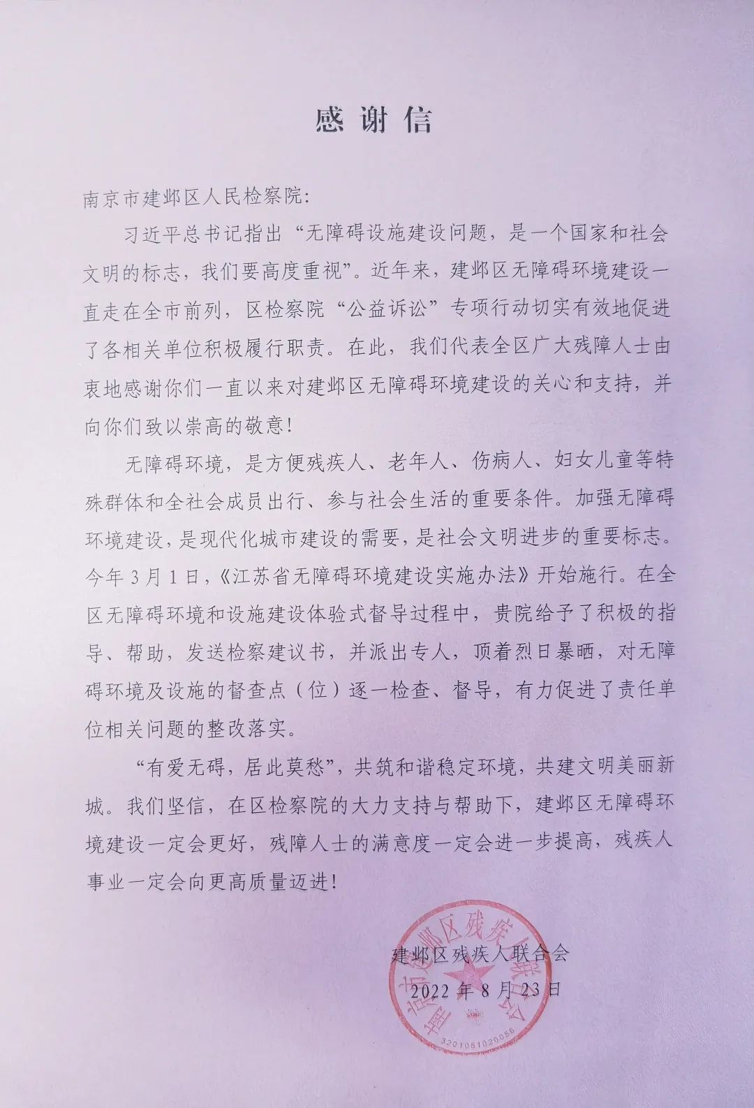 “无障碍设施建设问题,是一个国家和社会文明的标志”,建邺区best365登陆_365速发国际平台登陆_谁知道365足球网站院将继续落实上级院各项要求,围绕《江苏省无障碍环境建设公益诉讼专项监督活动方案》,将现有的21件线索制发best365登陆_365速发国际平台登陆_谁知道365足球网站建议,督促行政机关及时整改,并继续在与各行政机关建立长效协作机制、完善公共场所和公共交通的无障碍化建设、加大无障碍环境的法律法规的宣传引导等方面发力,不断提升残疾人、老年人等特殊群体在新时代的安全感、获得感和幸福感。