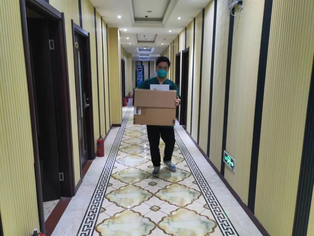 ▲点位长助理卫桢语在隔离酒店开展防疫物资分发工作