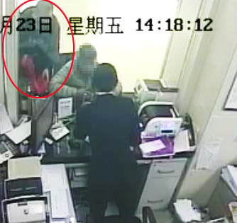另一犯罪嫌疑人(后面拿红袋者)陪受害人取钱